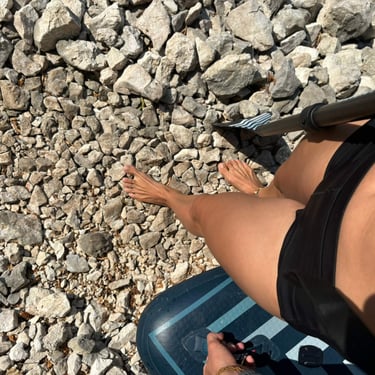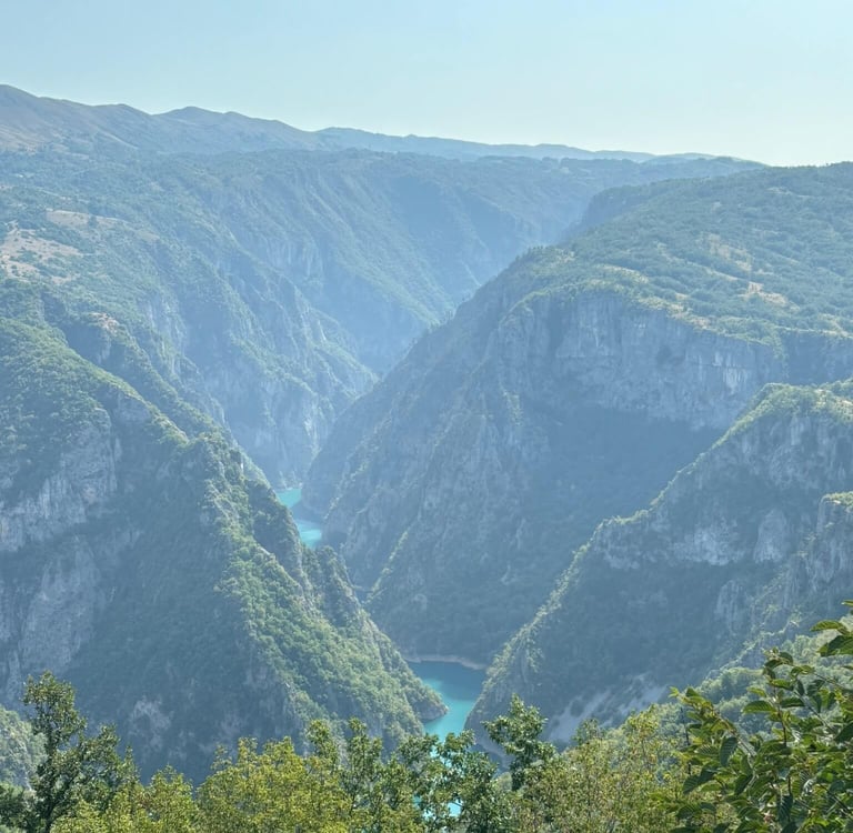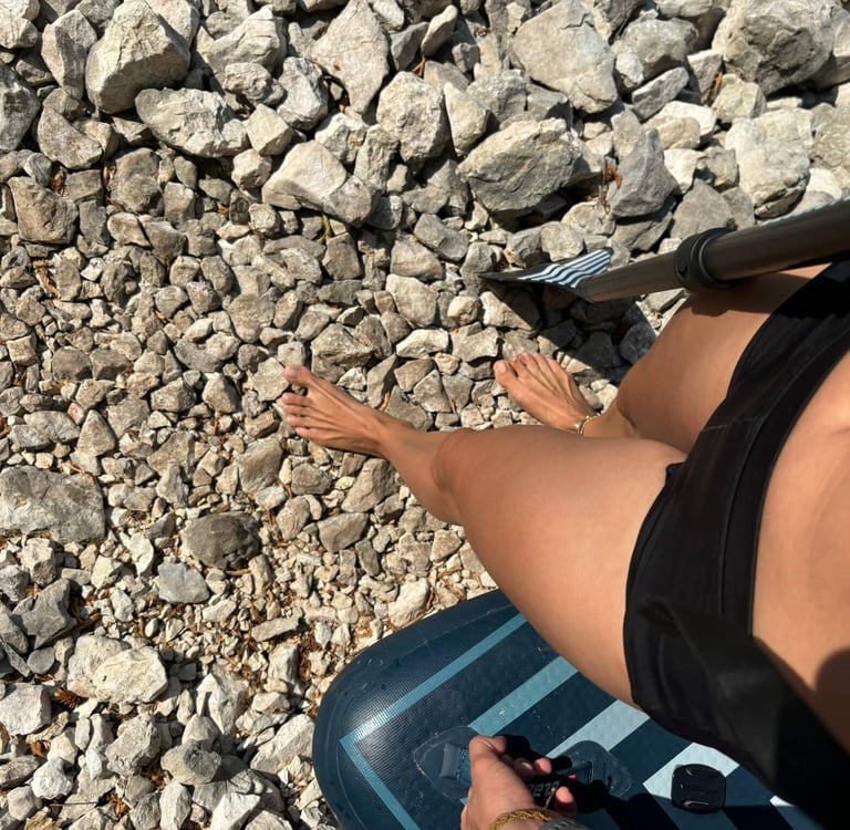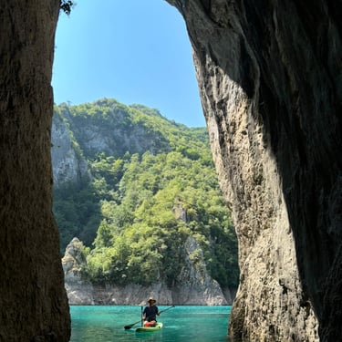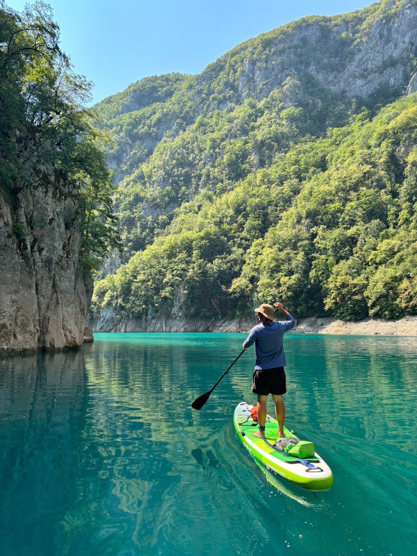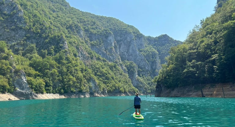 The Komarnica River is one of the last truly wild places in Montenegro. Part of its canyon disappeared when the dam creating Piva Lake was built in 1975, flooding sections of the valley – that is where we will paddle. The canyon feels remote and raw, and the scenery is just stunning. The starting point is a bit difficult to access, which means carrying paddleboards down a steep path of loose gravel and rocks. And a small tip: don’t go barefoot like we did, thinking, "The path doesn’t look that bad from the road." It definitely is harsh for the feet. Luckily, we met some kind young road trippers from Germany who helped us carry the boards down to the riverbank. Thanks again, guys!