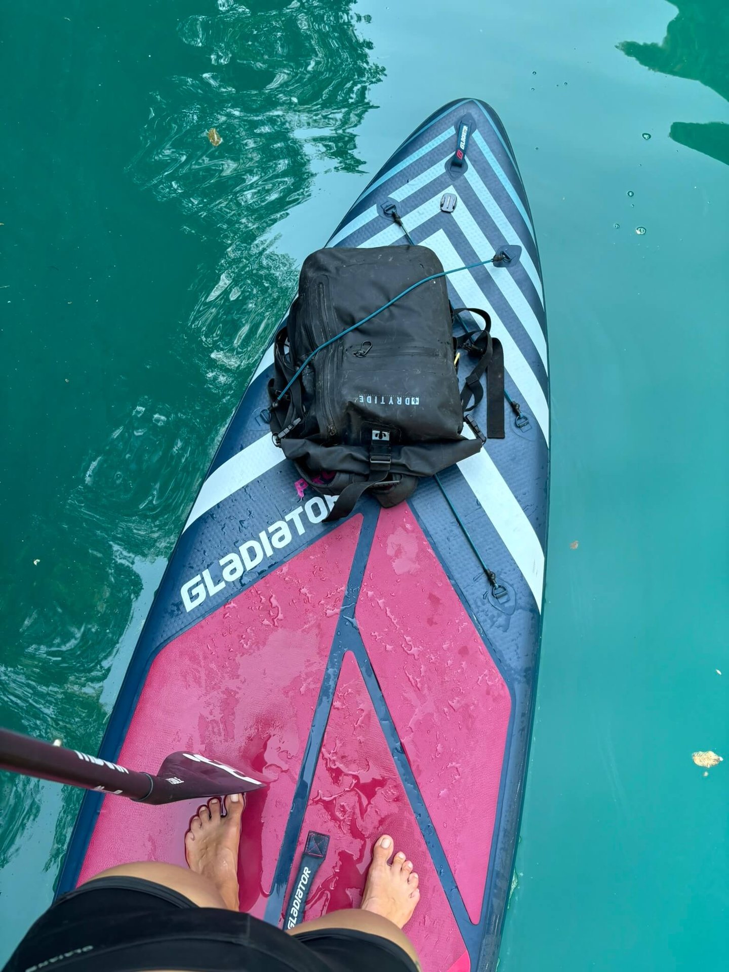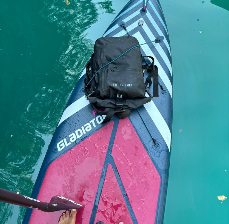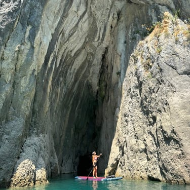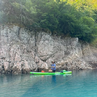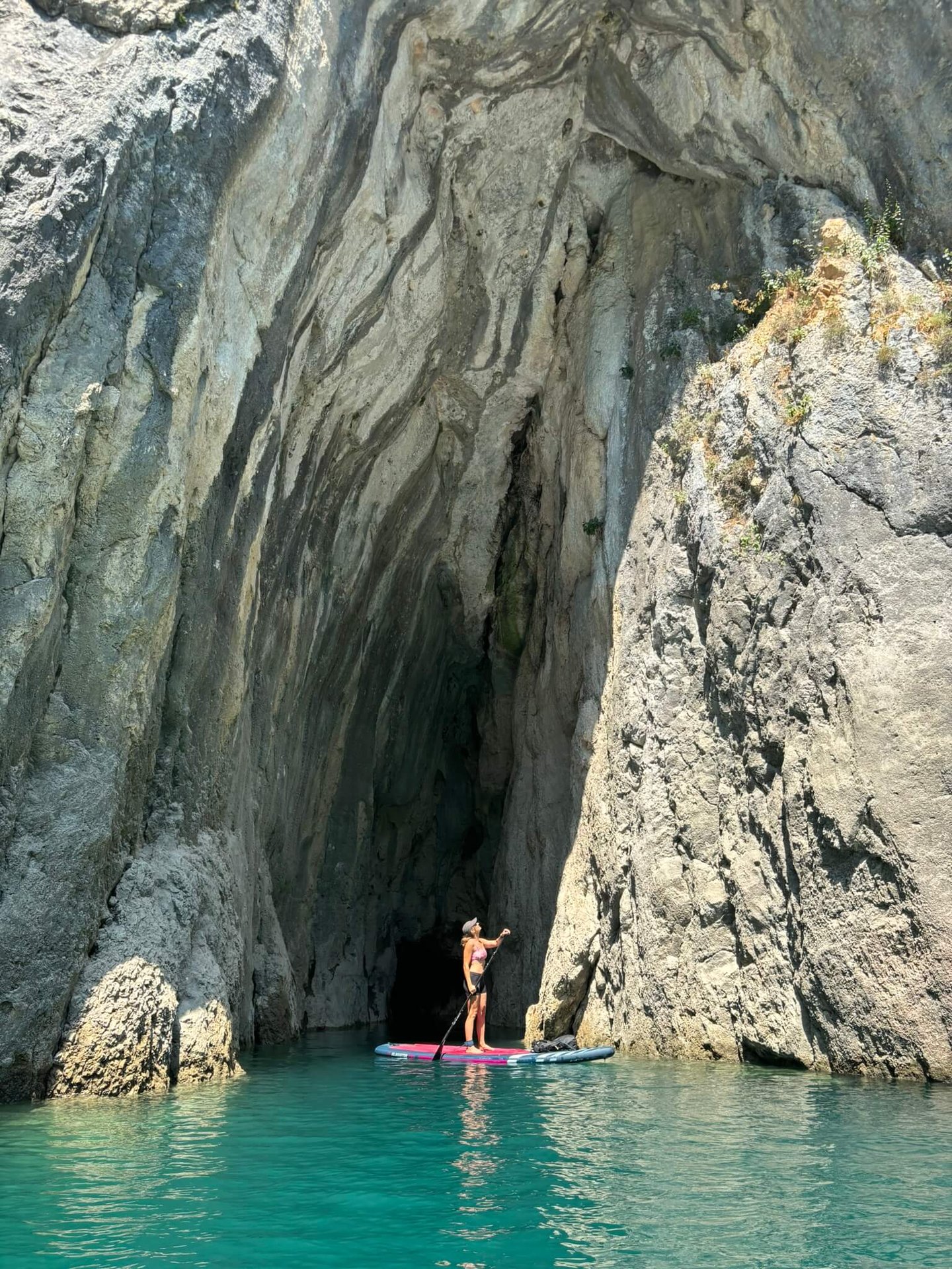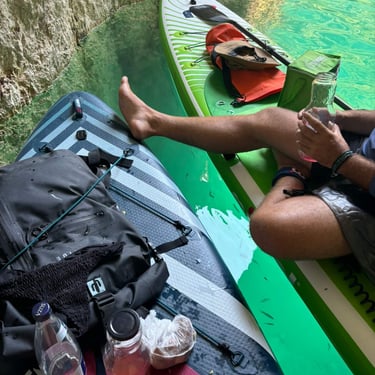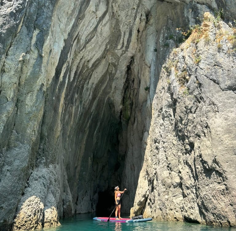 The moment we entered the canyon, everything changed – pure magic and flatwater conditions for paddleboarders. Steep limestone cliffs surrounded us, with water in shades of blue and green. I have never seen colour like this before. So inviting, we have to take a dip, and I can say it's the best dip of the whole summer. The canyon can be paddled for up to 11 kilometres, but as we went deeper, the wind started picking up. Soon it was pushing us forward so strongly that our boards glided across the water even without paddling. That was our sign not to go too far — because whatever pushes you in will make the way back much harder, and there is no phone signal in the canyon. We turned around after 6 km and found shelter in a big cave, where we ate our food and even saw a cool water snake climbing on its walls. I wish I knew the species! Moments like this are why we love paddleboarding so much.