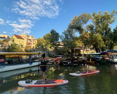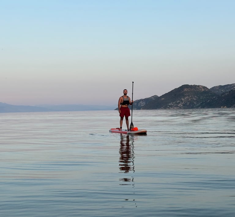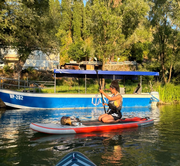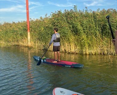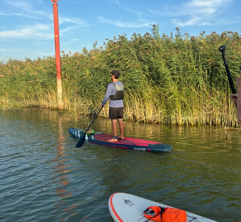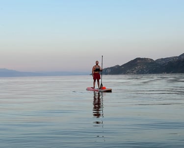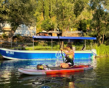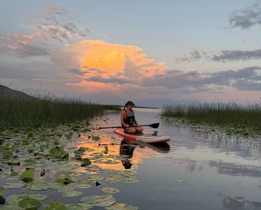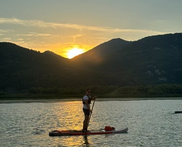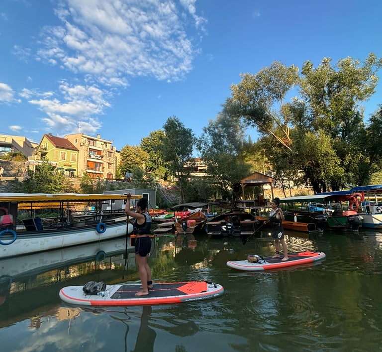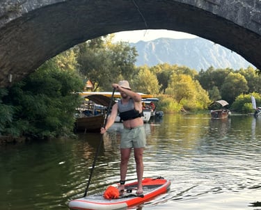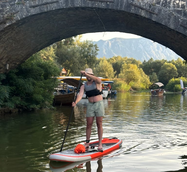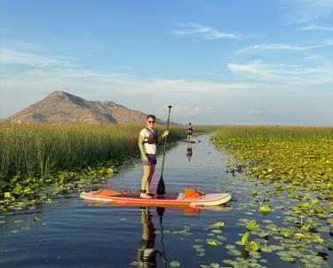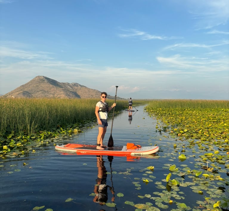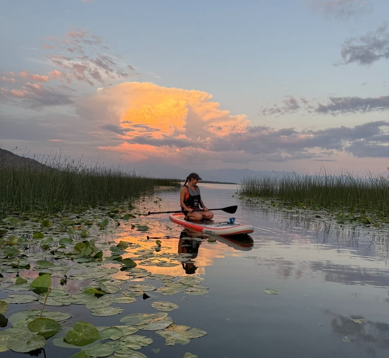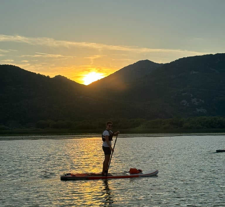 We meet in Virpazar in the late afternoon, usually at 18:00. We start with a safety briefing on land on how to use paddleboards. After we hop on boards and take some time in the water to practise how to operate boards before we take off. We paddle under the famous bridge in the village into the main channel of the village. Soon we turn to a narrow channel full of water lilies and reeds, which will lead us to the open lake. Perfect spot for an amazing picture. If you want, you can take a dip to refresh yourself at the sunset colours. The whole SUP tour is about 5 km.